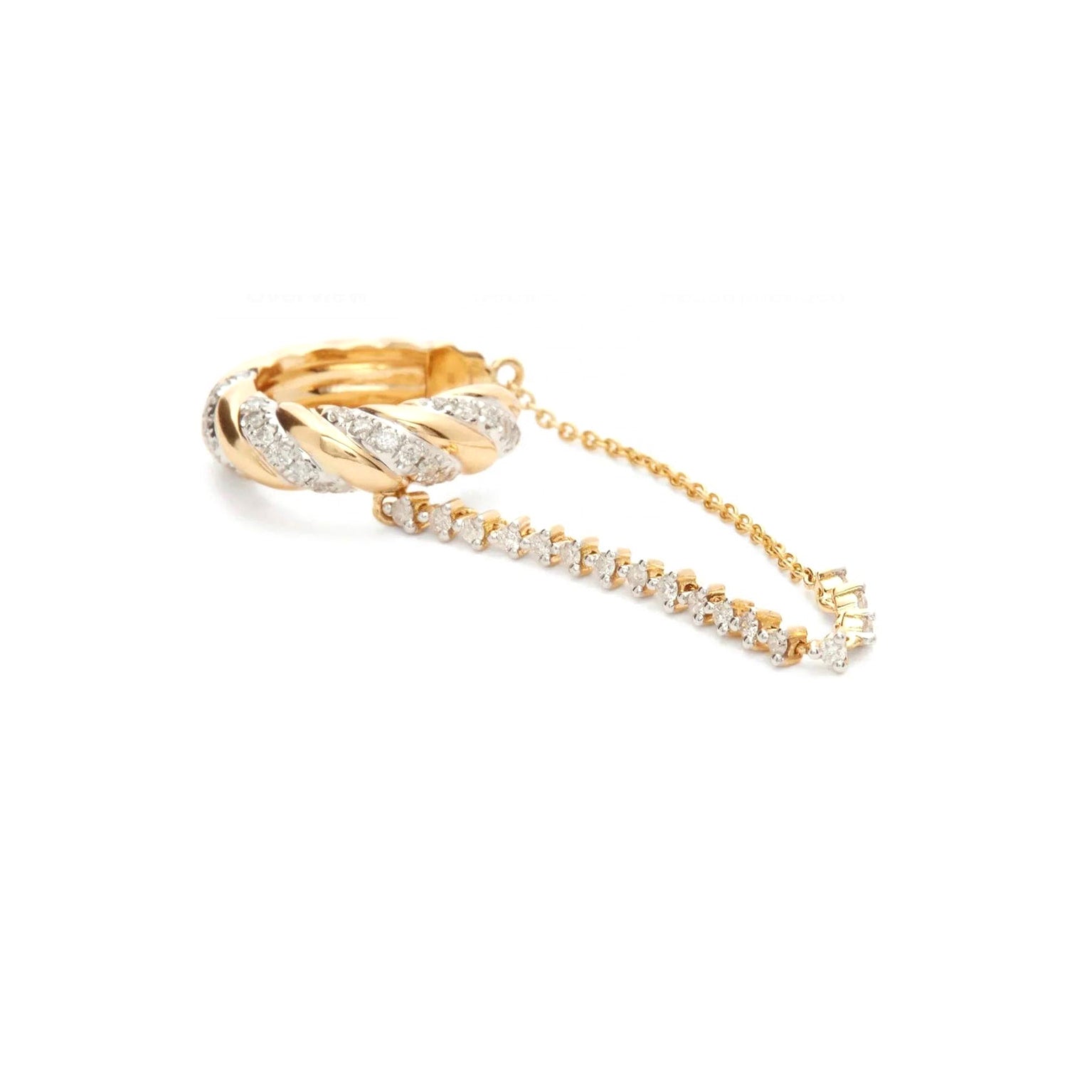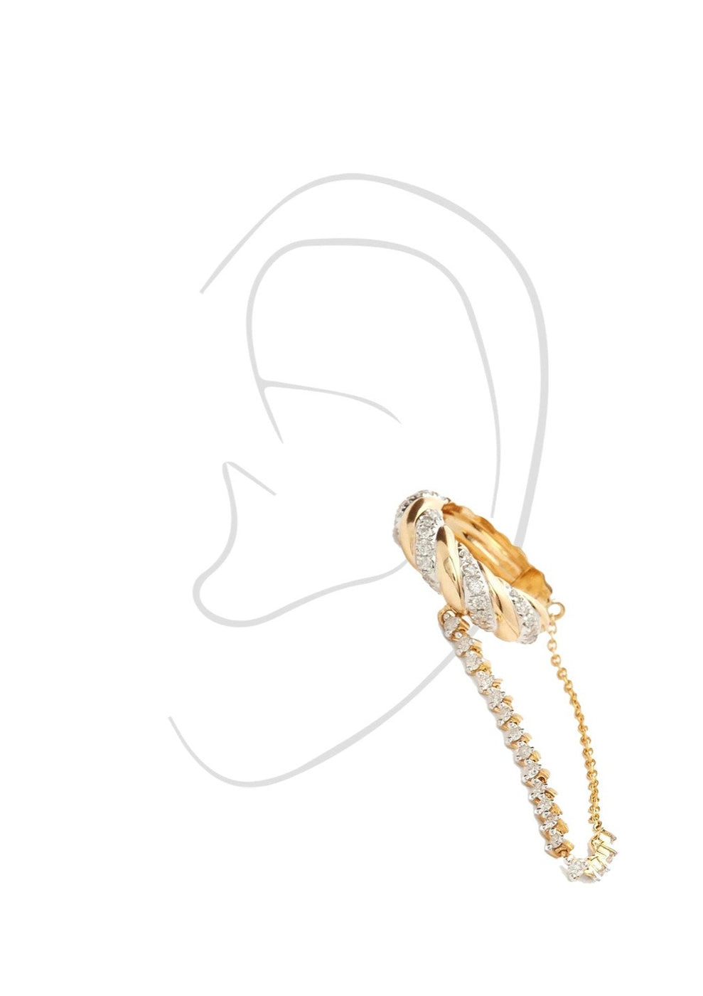 Our best selling Rona ring has been reimagined into a striking ear cuff! Our Circles ear cuff features a croissant dôme with rows of pavé and a dangling strand of stones. Wear stacked with your favourite Tati studs and finish with the matching ring!